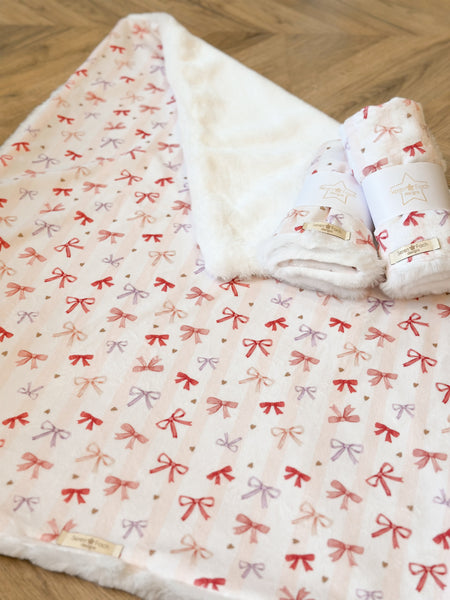 A Beautiful pink bow and striped design backed with a cuddly soft white cuddle fur.