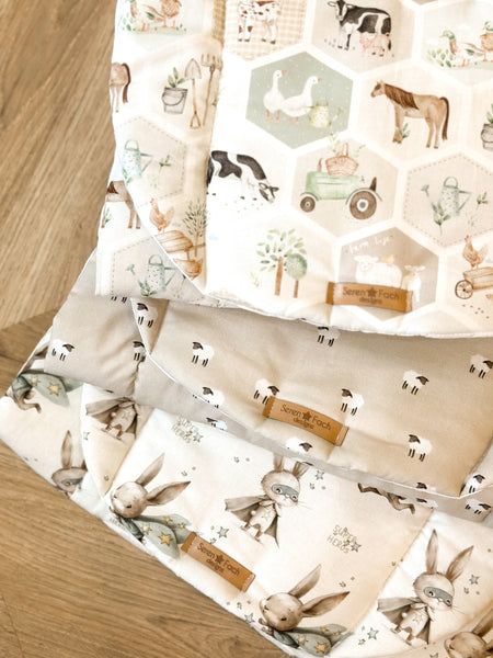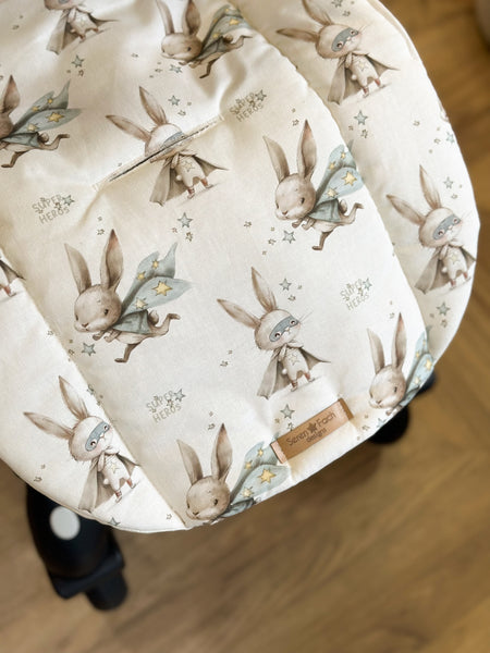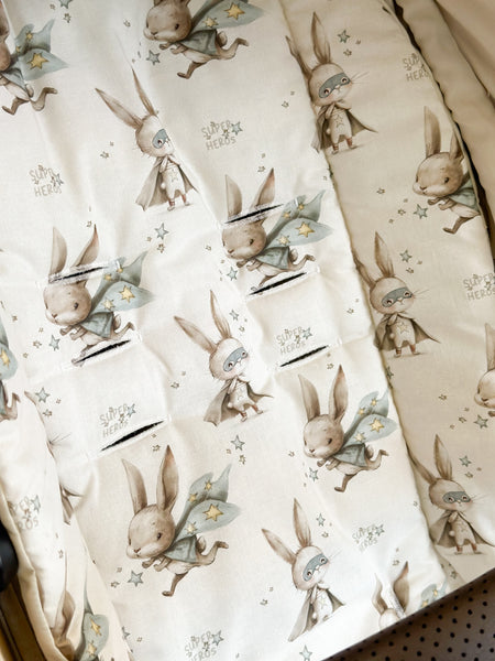 Bunny Super Hero blue and beige print with a ivory background design in a cool cotton style perfect for summer days.