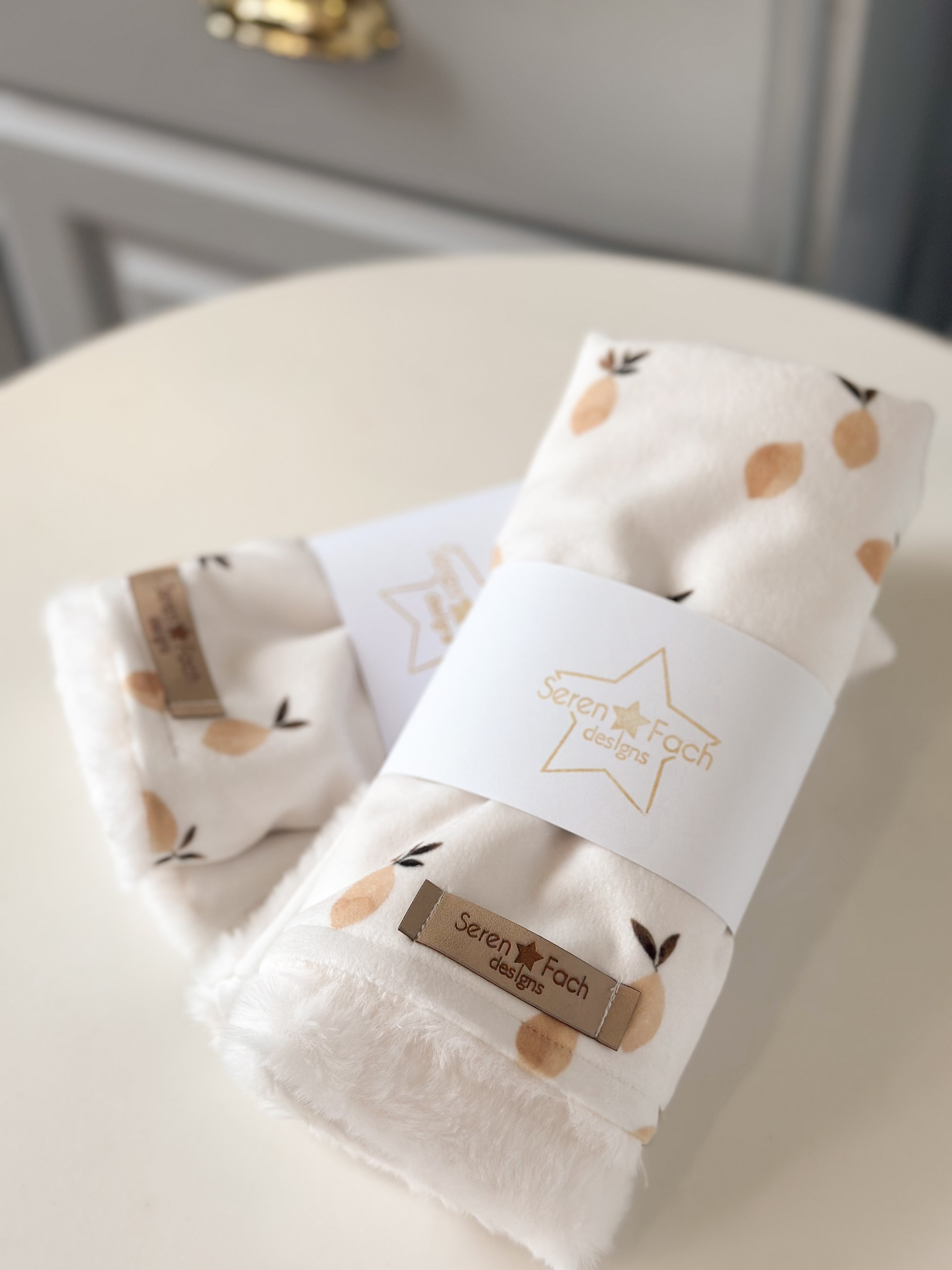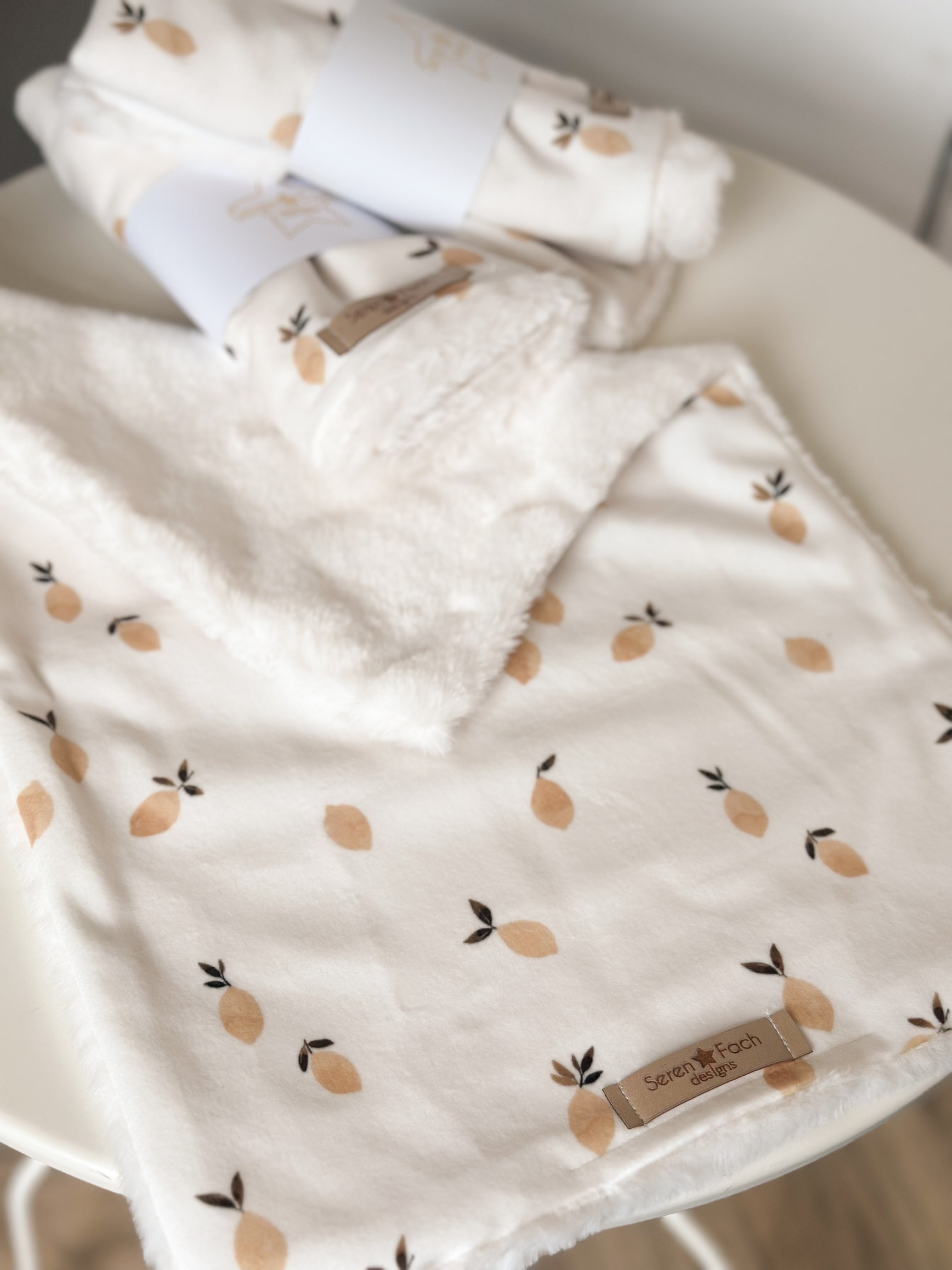 A little lemon design, white soft velvet on the one side backed with a soft white fur.