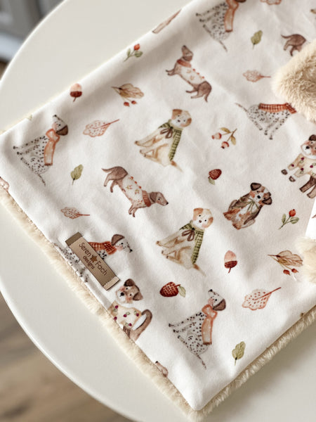 A gorgeous autumn doggie design, soft velvet patterned front on the one side backed with an almond soft fur.