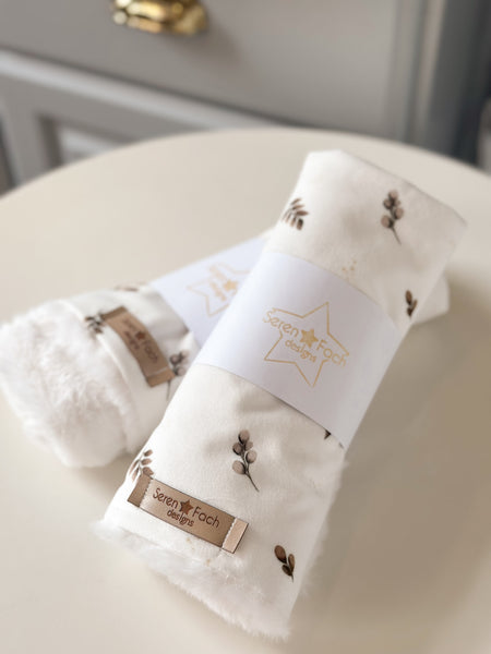 A neutral leaf design, white soft velvet on the one side backed with a soft white fur.