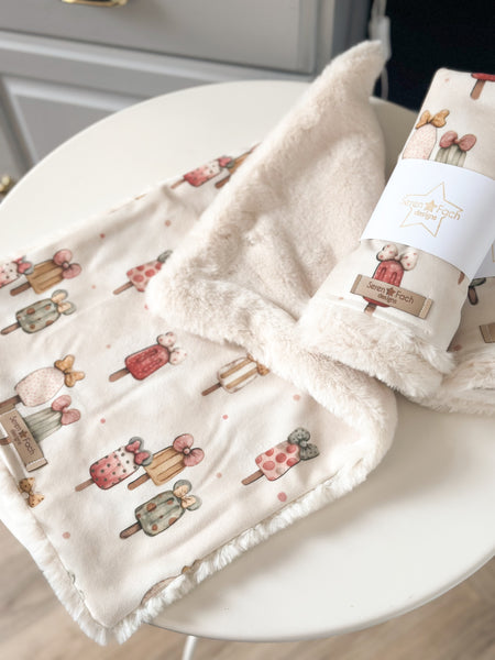 A delicious design, with colourful popsicle and beige background soft velvet on the one side backed with a soft beige fur.