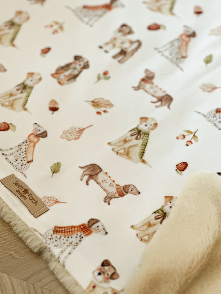A gorgeous soft velvet autumn doggie design backed with a cuddly soft beige fur.