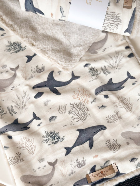 A whale design, beige and blue soft velvet on the one side backed with a soft frost beige fur.